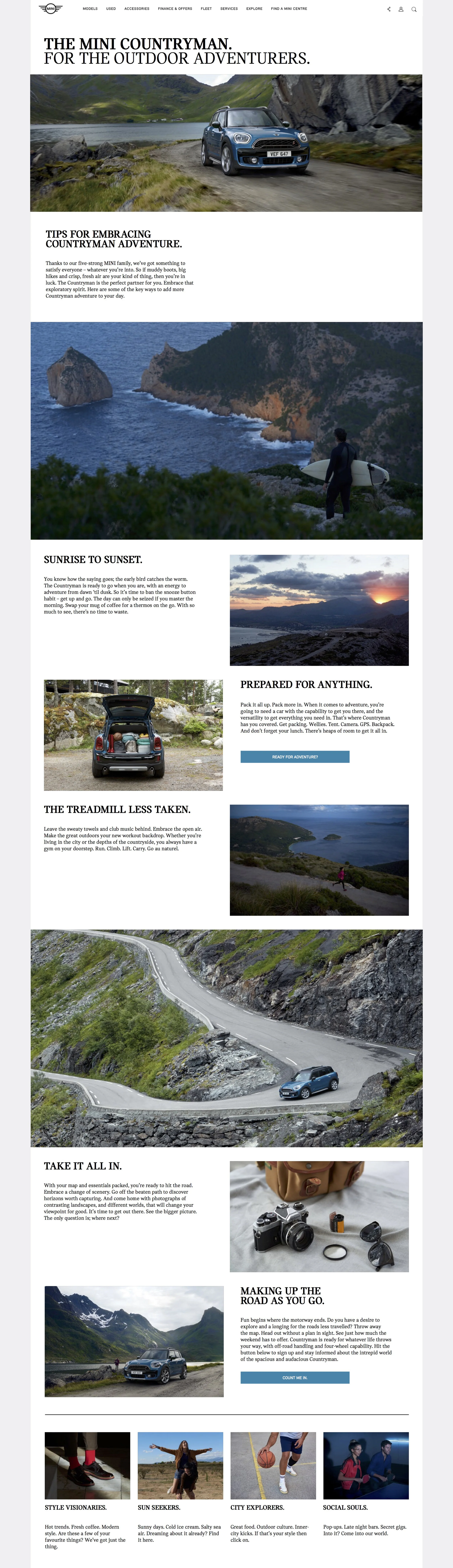MINI is an invitational brand and wanted to pose the question of ‘Who’s In?’. Whether you’re into whipped ice cream, hiking hills or minimalist architecture - if you’re IN there’s a MINI for you. We created 5 different worlds for the 5 different MINI personalities. This helped people find their MINI through their passion. Or you could just get the one you want. Beep beep!